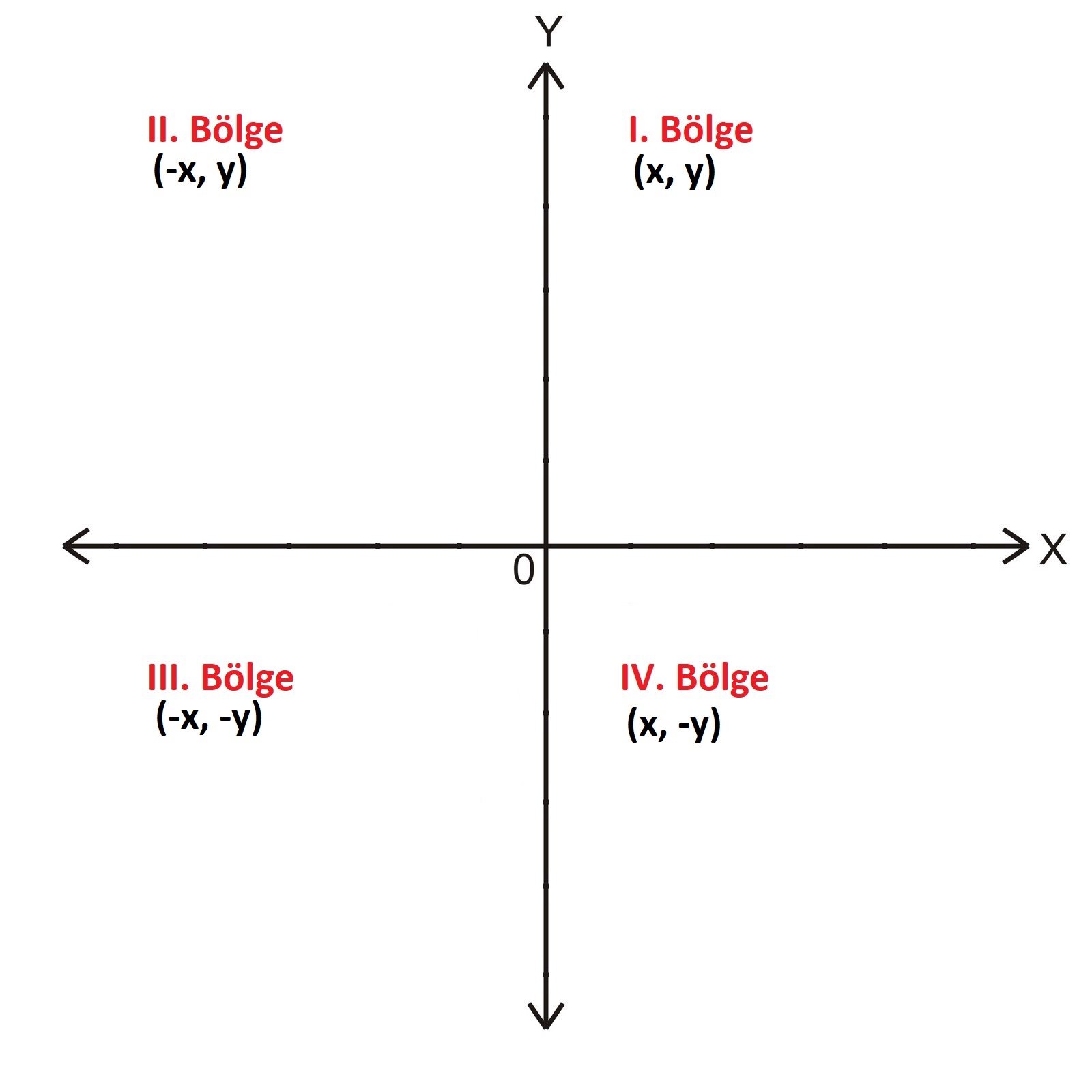 Analitik Düzlemde x eksenine “apsis”, y eksenine “ordinat” denir. Analitik düzlem üzerindeki apsis ve ordinatın pozitif ve negatif durumları;
